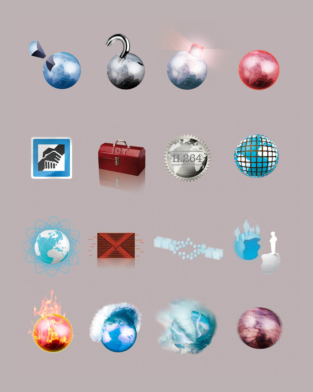 Icon’s collection designed for various presentation means in the International Telecommunication Union of Geneva. Themes variated from cyber-security, spam, climate change, ICT tools, internet and many more.