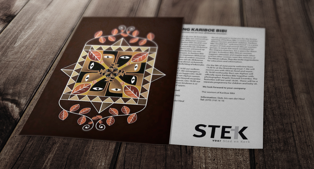 Invitation card for the opening of Kariboe Bibi, a new foundation focused on helping and connecting African immigrant women and their families. Inspiration for the cover illustration was found in African art representing the vision of the organization.